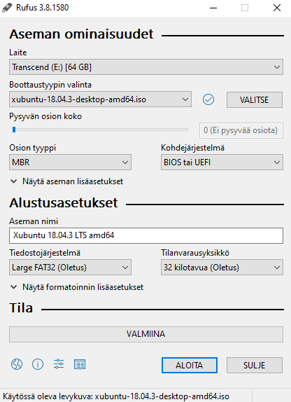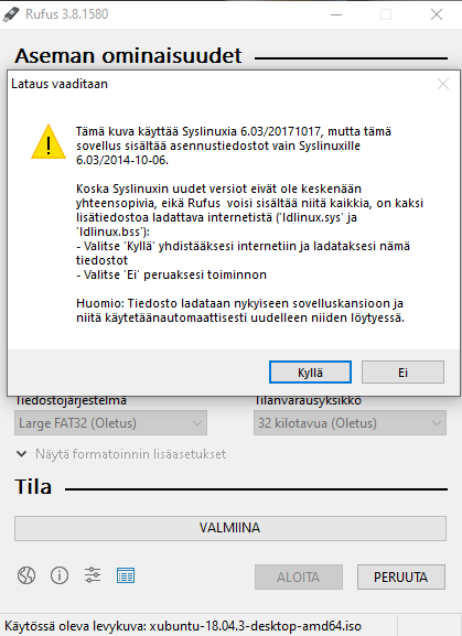 Tämän tehtyäni jätin kaikki asetukset oletukselle ja klikkasin ohjelman valikosta kohtaa ”ALOITA”. Ruutuun tuli ponnahdusikkuna, jossa kerrottiin vaadittavista latauksista. Valitsin ”Kyllä”, jonka jälkeen tuli uusi ponnahdusikkuna, josta valitsin ”OK”. Tämän jälkeen ohjelma alkoi tekemään itse livetikkua, jonka tekemisessä kesti muutama minuutti. Livetikun valmistuttua suljin Rufus -ohjelman.