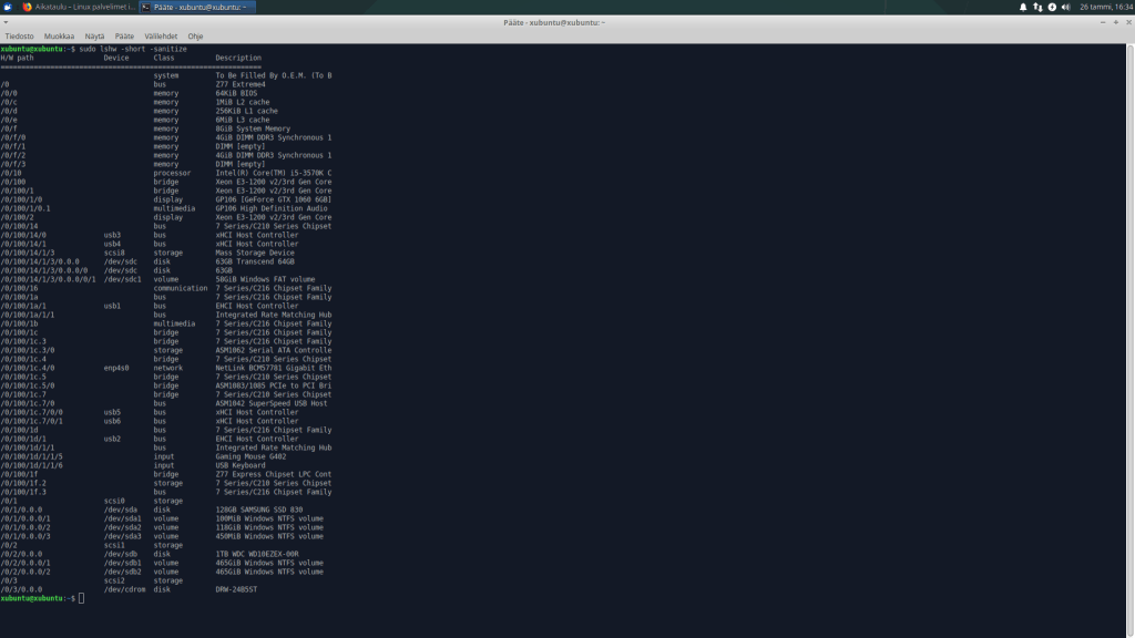 Avasin Xubuntun työpöydältä, vasemmasta yläkulmasta, valikon. Valikosta käynnistin komentokehotteen. Komentokehotteeseen kirjoitin ”sudo lshw -short -sanitize”, minkä jälkeen komentokehotteessa näkyi koneeni tiedot.