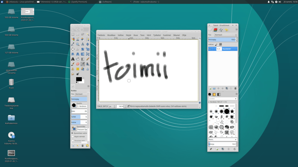 Asensin kuvankäsittelysovelluksen nimeltä GIMP suoraan Xubuntun komentokehotteesta, johon pääsee aiemmin mainitsemallani tavalla. Komentokehotteeseen kirjoitin ”sudo apt-get install gimp” ja painoin näppäimistöstä Enteriä. Ohjelmaa asentaessa tuli jokin kysymys, johon vastasin ”kyllä” kirjoittamalla komentoriville kirjaimen ”k” ja painamalla enteriä. Asennuksen jälkeen käynnistin GIMPin linuksin työpöydän vasemman yläkulman valikon kautta. Kyseisessä valikossa kirjoitin hakukenttään ”gimp”, minkä jälkeen ohjelman käynnistyskuvake ilmestyi ruudulle. Klikkasin käynnistyskuvaketta ja GIMP käynnistyi. Kokeilin kuvankäsittelyohjelmaa kirjoittamalla sen avulla tekstin ”toimii”. Totesin sovelluksen toimivan, minkä jälkeen suljin sen.