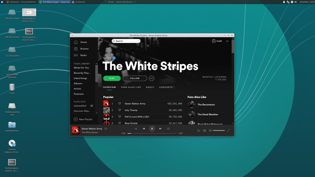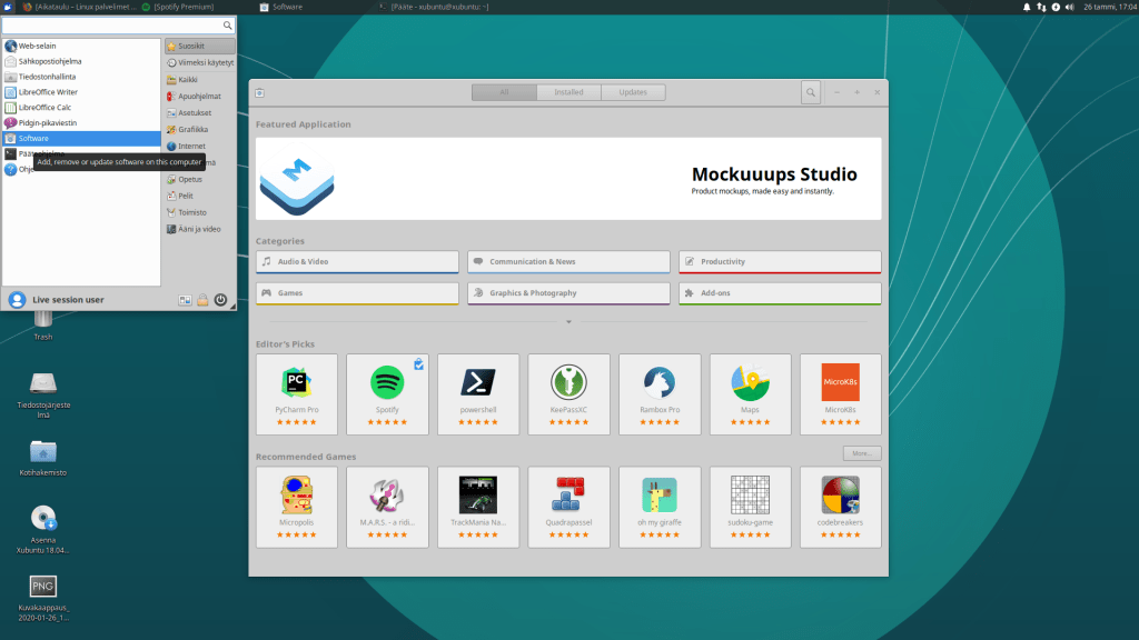 Seuraavaksi asensin Spotify-musiikkisovelluksen. Edellisestä poiketen päätin asentaa Spotifyn Xubuntun graafisen käyttöliittymän kautta. Klikkasin työpöydän vasemmasta yläkulmasta auki valikon (pieni sinivalkoinen ikoni). Kyseisestä valikosta klikkasin auki Software -nimisen sovelluksen. Tämän sovelluksen kautta pystyi etsimään erilaisia sovelluksia Linuxille. Spotify sattui olemaan näkyvillä heti sovelluksen aloitusnäkymässä.