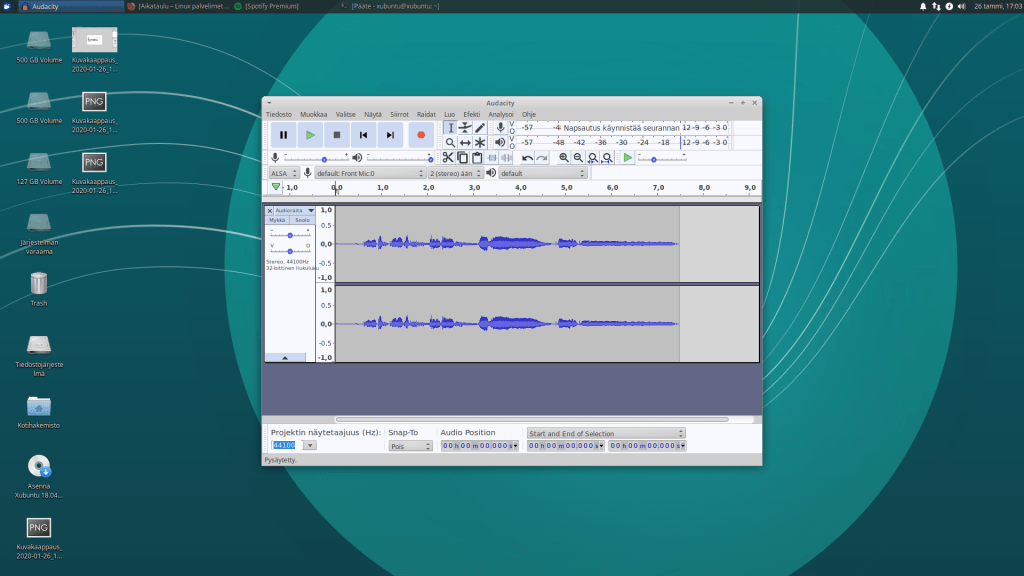Seuraavaksi halusin asentaa Audacity-äänieditointisovelluksen. Käynnistin jälleen työpöydän vasemman yläkulman ikonin (pieni sinivalkoinen) takaa olevan Software -sovelluksen. Sovelluksen avauduttua, klikkasin sovelluksen oikeassa yläkulmassa olevaa suurennuslasin kuvaketta, minkä jälkeen pystyin kirjoittamaan etsimäni sovelluksen nimen. Tässä tapauksessa kirjoitin hakukenttään ”Audacity”. Ohjelma löytyi nopeasti, ja asennus sekä sovelluksen käynnistys tapahtuivat täysin samalla tavalla kuin aiemmin kertomani Spotifyn asennus, joten en mainitse kyseisiä toimenpiteitä tässä uudelleen. Ennen sovelluksen käynnistämistä kytkin tietokoneeseeni mikrofonin. Sovelluksen käynnistyttyä kokeilin tallentaa sillä ääntäni. Ääni tallentui moitteettomasti, minkä jälkeen totesin sovelluksen sekä mikrofonin toimivan. Suljin sovelluksen ja siirryin seuraavaan tehtävään.