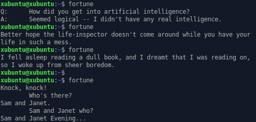 Toiseksi ohjelmaksi valitsin Fortune-nimisen ohjelman. Ohjelma asentui komentokehotteessa komennolla sudo apt-get install fortune. Ohjelman käynnistin kirjoittamalla komentokehotteeseen ohjelman nimen (fortune) ja painamalla Enteriä. Joka kerta kun kirjoitin komentokehoitteeseen ohjelman nimen, niin ohjelma vastasi komentokehotteessa jollakin lauseella. Totesin ohjelman toimivan.