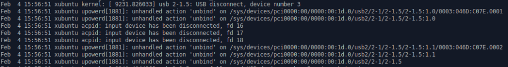 Logimerkinnöistä kävi selvästi ilmi, että USB-laite oli irroitettu USB-portista (”USB disconnect”). Logirivien alussa on tapahtuman päiväys sekä kellonaika (UTC +0). Kellonajan jälkeen tuleva ”xubuntu” viittaa käyttäjänimeen. Seuraavana tulevat ”kernel”, ”acipd” ja upowerd tarkoittavat ilmeisesti prosessia, josta logimerkintä on tullut. Kernel on Linuxin ydin, ja acipd sekä upowerd ovat demoneja. Hakasuluissa olevasta numerosta en löytänyt tietoa, mutta veikkaisin sen olevan jonkinlainen koodi. Logirivien lopusa on tekstikuvaus tapahtumasta. Suljin logitiedoston painamalla näppäimistöstäni näppäintä Q.
