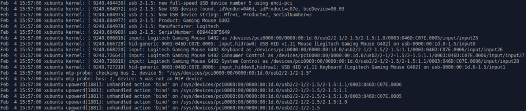 Uudet lgirivit noudattivat samaa kaavaa edellisten kanssa. Mtp-probesta en löytänyt kunnollista tietoa. Usb 2-1.5 viittaa USB-portin versioon. Uusien logimerkintöjen ensimmäisillä riveillä kerrottiin, että uusi USB-laite on kytketty (”New USB device found”). Seuraavat rivit puolestaan kertoivat, mistä laitteesta on kyse. Minun hiireni oli malliltaan Logitech G402. Olin hiukan yllättynyt siitä, kuinka tarkat tiedot hiirestä annettiin. Suljin logitiedoston painamalla näppäimistöstä näppäintä Q.