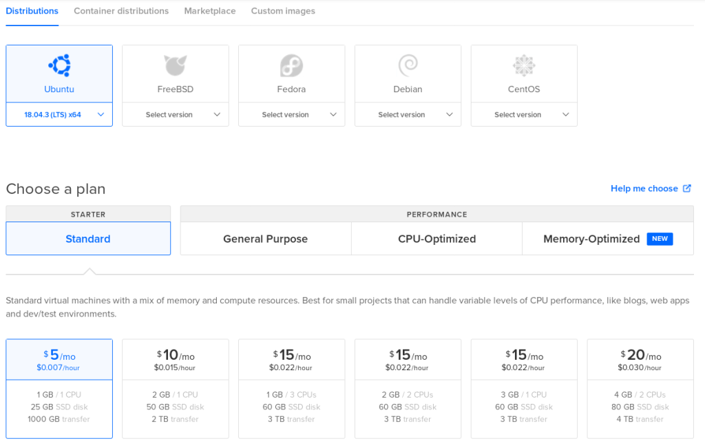 Nyt pääsin itse palvelimen luomiseen. Ensiksi valitsin distroksi Ubuntun 18.04.3 (LTS) x64, ja planiksi standardin. Halusin halvimman, eli 5$/kuukausi, vaihtoehdon, joka löytyi valitsemalla ”show all plans”.