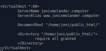 Sivustoni oli paikallisella koneella /home/xubuntu/Downloads/, jonne navigoin komentokehotteessa. Komennolla scp -r public_html joni@jonismolander.computer: kopioin public_html-kansion paikalliselta koneeltani palvelimelle. Kansio kopioitui palvelimelle kohteeseen /home/joni/. Tämän jälkeen tein palvelimelle, kansioon /etc/apache2/sites-available/, tiedoston nimeltä jonismolander.computer.conf. Kyseiseen asetustiedostoon kirjoitin alapuolella näkyvän sisällön.