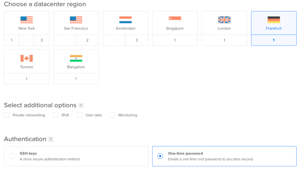 Seuraavaksi valittiin palvelimen maantieteellinen sijainti. Halusin palvelimen sijaitsevan EU:ssa, joten päädyin valitsemaan Saksan.Authenticationiksi otin sähköpostiin lähetettävän salasanan. Tämä ei ole ilmeisesti niin turvallinen kuin SSH-avain, mutta en tiennyt miten SSH-avain toimii, joten en sitä ottanut.