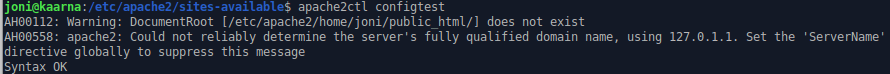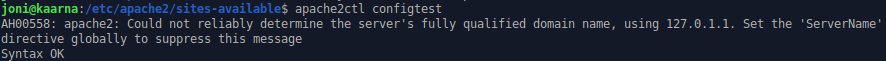 Käynnistin varmuuden vuoksi apachen jälleen uudestaan, minkä jälkeen taas komennon apache2ctl configtest. Tällä kertaa sain virheilmoitukseksi seuraavan teksin: