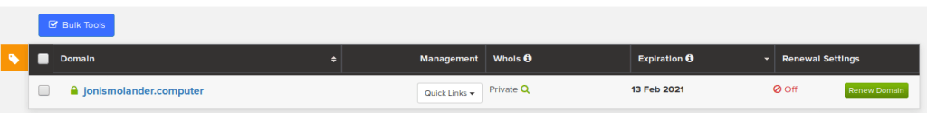 Olin jo oppitunnilla tehnyt tunnukset Name.com -nimiseen palveluun. Kirjauduin tunnuksillani sinne, ja valitsin sivun oikeasta yläreunasta ”My Domains”. Avautuneella sivulla oli aiemmin tunnilla luomani jonismolander.computer -niminen domain, jota klikkasin.