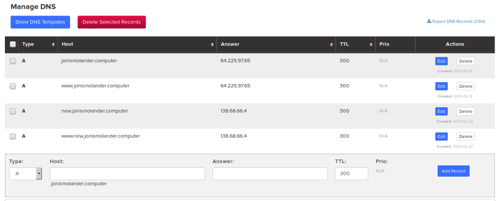 Seuraavaksi klikkasin kohdasta ”Manage DNS Records”, josta pystyin yhdistämään nimen IP-osoitteeseen. Answer -kohtaan kirjoitin, juuri DigitalOceanista vuokraamani, palvelimen IP-osoitteen 138.68.66.4. Host-kohtaan kirjoitin ”new”, minkä jälkeen klikkasin kohdasta ”Add Record”. Loin vielä yhden nimen samalle osoitteelle, käyttäen nyt tekstiä ”www.new”. Nyt minulla oli osoitteelle 138.68.66.4 kaksi nimeä: