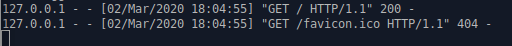 Ylempi rivi on onnistunut sivulataus. Alempi rivi on käsittääkseni virheilmoitus epäonnistuneesta favicon.iconin lataamisesta. En kuitenkaan nähnyt tämän haittaavan tehtävän suorittamista, joten totesin Flaskin toimivan kehitysympäristössä ja jatkoin eteen päin.