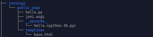 Loin public_wsgi -kansioon templates -kansion. Templates -kansioon loin tiedoston base.html, jonka sisältö oli seuraavanlainen: