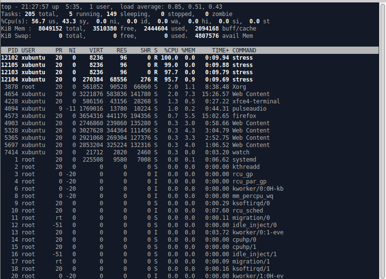 Avasin uuden terminaali-ikkunan, johon annoin komennon top. Käsittääkseni kyseisellä komennolla näkee käynnissä olevat prosessit. Annoin uudelleen aiemman stess-komennon ja seurasin samalla toisesta ikkunasta prosessilistausta. Ikkunaan ilmestyi merkinnät stressiprosesseista, joiden suoritinkäyttö oli melkein 100% (%CPU). Muistin käyttö oli olematonta (%MEM).