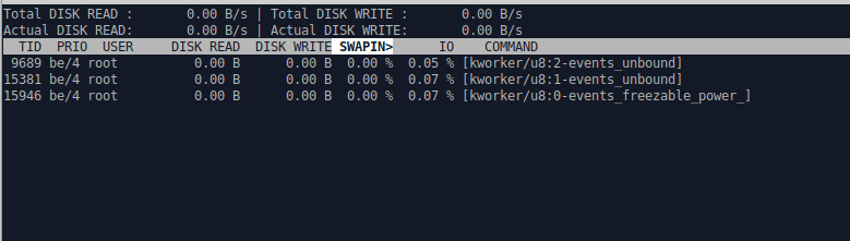 Asensin sovelluksen komennolla sudo apt-get install iotop ja käynnistin sen omassa ikkunassa komennolla sudo iotop -oa. Jos ymmärsin oikein, niin komennossa -o näyttää vain ne prosessit, jotka vaikuttavat I/O:n. -a määritettä en oikein ymmärtänyt, mutta eri komennoista voi lukea lisätietoa täältä. Komento sudo iotop ei rajaa mitään prosessia pois, vaan näyttää kaikki prosessit.