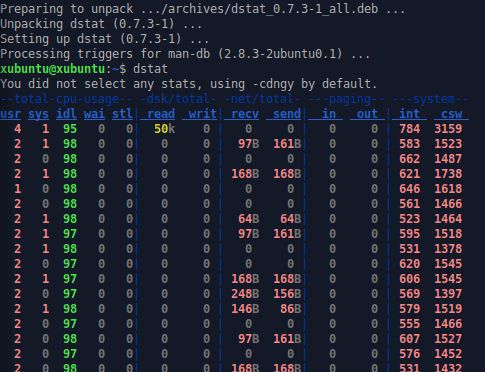 Dstatin avulla voit seurata järjestelmän osien tilaa. Asensin sovelluksen komennolla sudo apt-get install -y dstat ja käynnistin sen komennolla dstat. Ohjelma näyttää mm. suorittimen ja kovalevyn rasituksen. Ajoin jälleen saman stressitestin komennolla stress -c 2 -i 1 -m 1 –vm-bytes 256M -t 15s ja seurasin mahdollisia muutoksia dstatista. Prosessorin siirtymisen levosta rasitukseen näki jälleen selvästi.