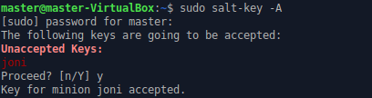 Jotta annetut asetukset tulisivat voimaan, piti slave-demoni käynnistää uudestaan komennolla sudo systemctl restart salt-minion.service. Nyt slaven pitäisi automaattisesti lähettää masterille julkinen avain, joka täytyy hyväksyä master-koneelta. Testataan tämä master-koneella komennolla sudo salt-key -A. Kyseisellä komennolla hyväksytään kaikki masterille tulevat avaimet. Lisää eri salt-key -komennoista voi luke tästä. Terminaali-ikkunaan tulostuu lista avaimista. Listalla oli vain yksi avain, joka näkyi aiemmin Minion -tiedostoon antamallani id:llä ”joni”. Tämä avain hyväksytään antamalla komento y. Nyt masterin ja slaven välille on saatu muodostettua yhteys.