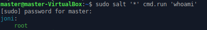 Testasin yhteyttä antamalla masterille komennon sudo salt ’*’ cmd.run ’whoami’, jolloin terminaaliin tulostui ”joni: root”. Koneiden välinen yhteys toimi. Saltissa ’*’ tarkoittaa komennon koskevan kaikkia slave-koneita. Minulla on vain yksi slave-kone, joten olisin yhtä hyvin voinut kirjoittaa tähden paikalle slave-koneeni id:n, joka tässä tapauksessa oli joni.
