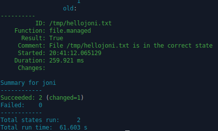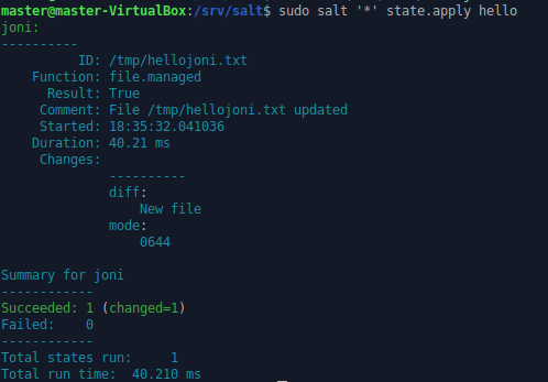 Komennolla sudoedit /srv/salt/hellojoni.txt tein tekstitiedoston, johon juuri luomassani hello.sls -tiedostossa viitattiin. Tekstitiedostoon kirjoitin vain tekstin ”Tervehdys!”. Hyväksyin luomani hello -tilan komennolla sudo salt ’*’ state.apply hello. Masterin terminaaliin tulostui teksti onnistuneesta muutoksesta slave-koneella.