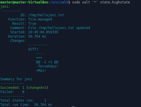 Muutin masterilla olevan hellojoni.txt -tiedoston sisällöksi ”Moi!”. En tiedä, miten usein slavet hyväksyvät top -tiedoston sisällön, mutta sen voi tehdä myös käsin komennolla sudo salt ’*’ state.highstate, jonka sitten annoinkin. Masterin terminaaliin tulostui jälleen viesti onnistuneesta muutoksesta.