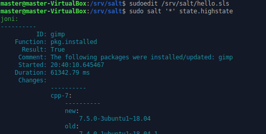 Nyt kun slave tarkistaa top.sls -tiedoston kautta hello.sls tiedoston, niin se huomaa uudet rivit, jotka ohjeistavat asentamaan GIMP -sovelluksen. Testasin toimiiko tämä. Annoin jälleen sudo salt ’*’ state.highstate -komennon. Aikansa mietittyään masterin terminaaliin tulostui tiedot onnistuneesta GIMP:n asennuksesta. Myös hellojoni.txt -tiedosto tarkistettiin, mutta siihen ei ollut tullut muutoksia, joten se pysyi entisellään.