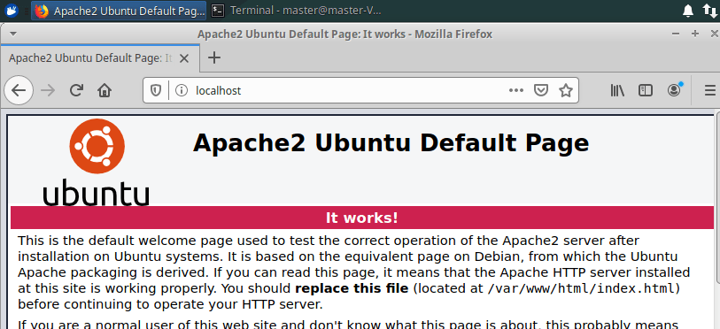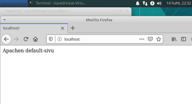 Minuutin verran raksuteltuaan, tuli ilmoitus onnistuneesta suorituksesta. Kävin slavella testaamassa tilanteen kirjoittamalla selaimen osoiteriville ”localhost”, jolloin Apachen default-sivu aukesi kuten oli tarkoituskin. Homma siis näytti toimivan toivotulla tavalla.
