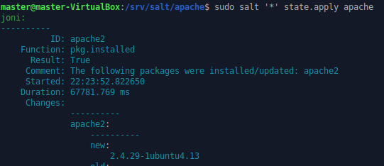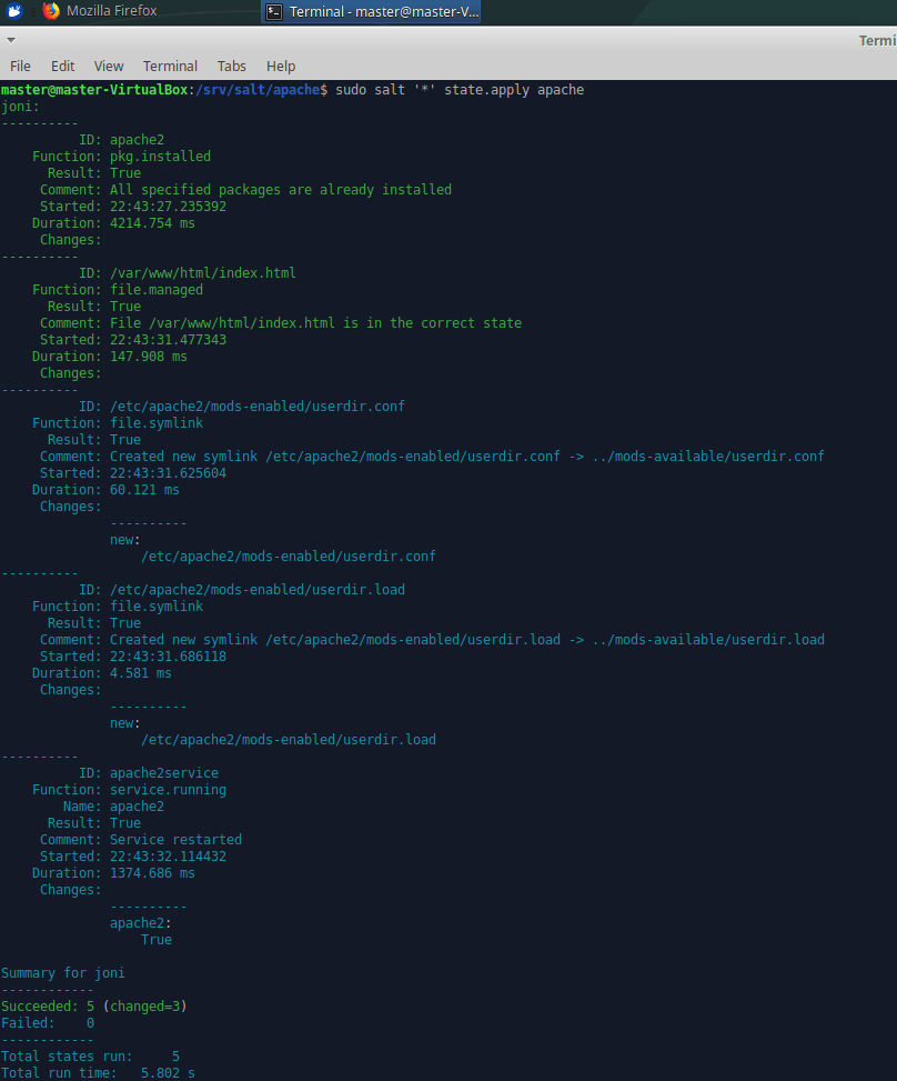Annoin jälleen komennon sudoedit salt ’*’ state.apply apache. Hetken miettimisen jälkeen tuli ilmoitus viidestä onnistuneesta suorituksesta, ja yhteensä muutoksia tehtiin kolme. Kaksi symlinkkiä luotiin ja Apache käynnistettiin uusiksi.