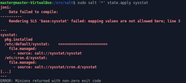 Lisäsin sysstat.sls -tiedostoon rivit asetustiedostoille, ja ajoin tilatiedoston uudestaan. Sain seuraavanlaisen virheilmoituksen: