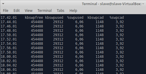 Kävin ensin tarkistamassa, ettei orjakoneella ole sysstatia asennettuna. (Komento sar -A, antoi ilmoituksen, ettei sysstatia ole asennettu)