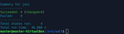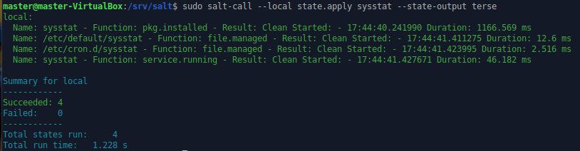 Ajoin masterilla komennon sudo salt-call –local state.apply sysstat –state-output terse testatakseni paikallisesti sysstat -tilan toimivuuden.