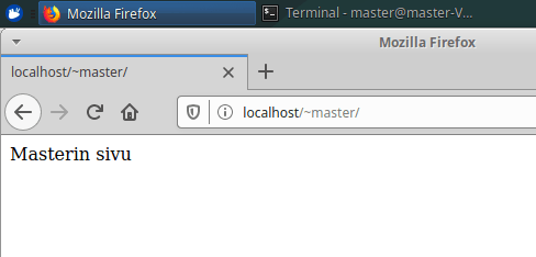 Menin slavelle ja tein käyttäjälle normaalein käyttäjäoikeuksin sivut, joiden sisällöksi kirjoitin ”Slaven sivut”. Selaimen osoiteriville ”localhost/~slave”, ja slaven sivut avautuivat. Toimii!.