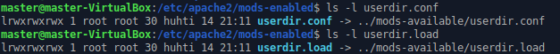 Annoin komennot ls -l userdir.conf ja ls -l userdir.load nähdäkseni lisätietoja tiedostoista. Kyseessä ovat symlinkit tiedostoihin, jotka sijaitsevat mods-available -kansiossa.