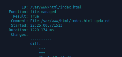 c) Aja jokin tila paikallisesti ilman master-slave arkkitehtuuria. Tutki debug-tulostetta. ’sudo salt-call –local state.apply hellotero –state-output terse’