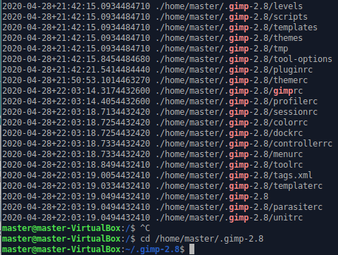 Annoin juurihakemistossa (onkohan oikea termi?) komennon find -printf ”%T+ %p\n”|sort |grep gimp, joka etsi viimeeksi muokatuttujen tiedostojen sijainnit laittaen ne aikajärjestykseen. Hakua rajasin tuolla |grep gimp määreellä, joka listasi vain ne tulokset, joissa kyseinen sana oli. Viimeisimmät muutokset oli tehty tiedostoihin polussa ./home/master/.gimp-2.8/. Kansio .gimp-2.8 on piilotettu kansio.