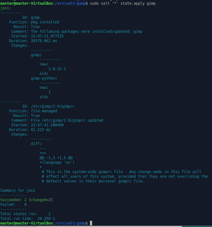Tila määrää saltin olevan asennettuna ja gimprc -tiedoston olevan sellainen kuin se on /salt/gimp/ -kansiossa. Kopioin /etc/gimp/2.0/gimprc -tiedoston kansioon srv/salt/gimp/ komennolla sudo cp -r /etc/gimp/2.0/gimprc /srv/salt/gimp/. Avasin kopion ja kirjoitin siihen aiemmin löytämäni asetusrivin: (language ”sv”). Nyt pitäisi kaiken olla valmista, joten testaamaan. Masterille komento: