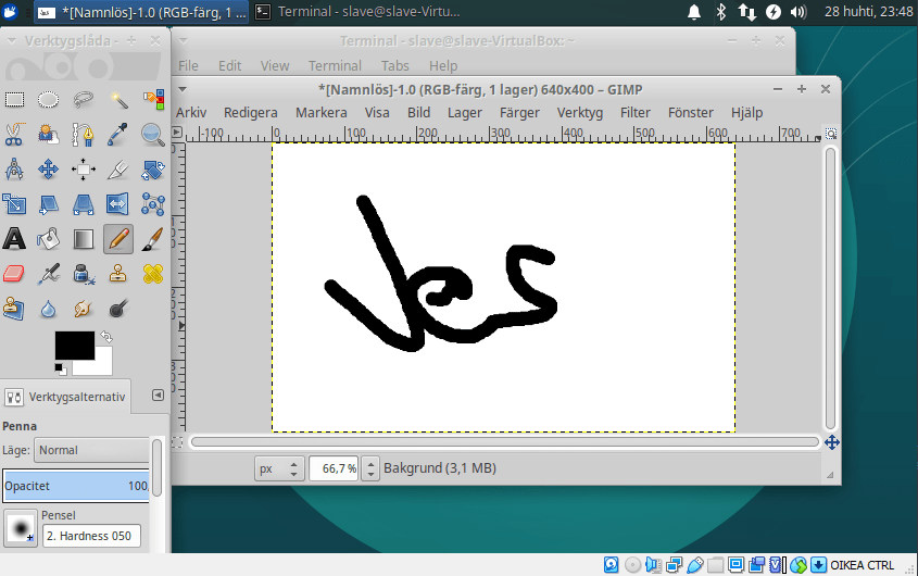 Avasin orjakoneelta gimpin tarkistaakseni, oliko se ruotsin kielinen ja olihan se. Ensimmäinen tila luotu, nyt pitäisi vielä opiskella ruotsin kieli, jotta pystyy GIMPiä käyttämään.
