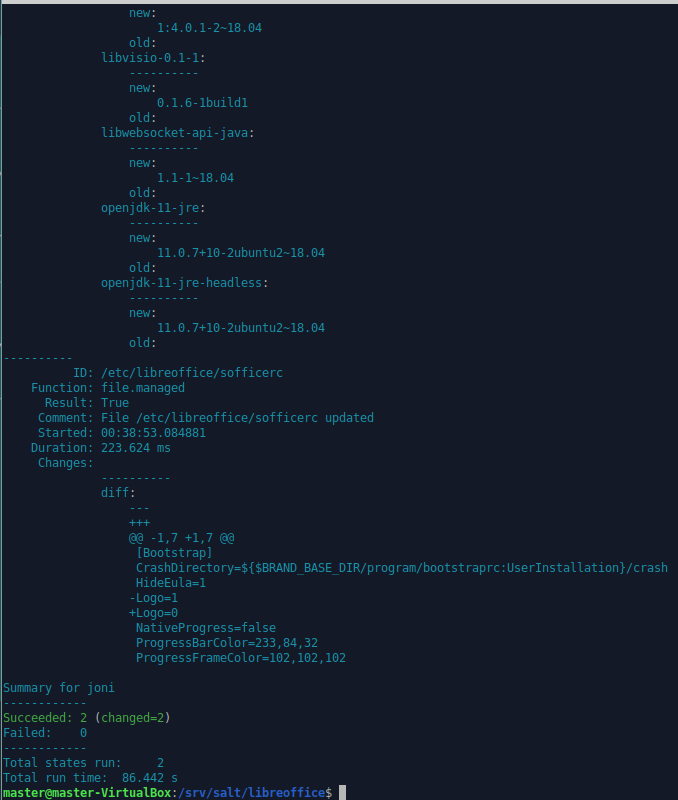 Tein kansion /srv/salt/libreoffice/ ja kansioon tiedoston init.sls. Init.sls tiedoston sisällöksi kirjoitin: