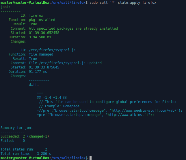 Sain ilmoituksen kahdesta onnistuneesta toiminnosta: Firefox oli asennettuna ja syspref.js tiedostoon muutettiin aloitussivuksi atkins.fi. Käynnistin orjalla Firefoxin tarkistaakseni toimiko muutos ja sivuksi aukesi atkins.fi. Tila siis toimi.