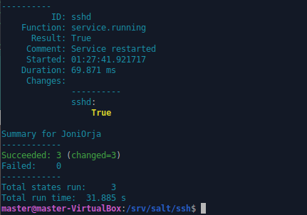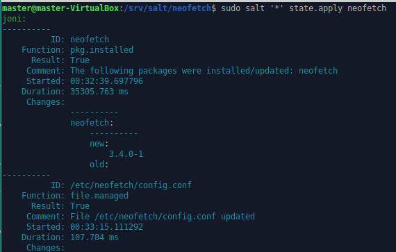 Muokkasin tiedostoa /srv/salt/neofetch/config.conf kommentoiden kaikki muut inforivit pois käytöstä lukuunottamatta OS, Host, Kernel ja Uptime rivejä. Kyseisessä tilassa Neofetchin pitäisi olla asennettuna ja kun ohjelma käynnistyy, niin terminaaliin tulisi tulostua vain nuo kolme tietoa.