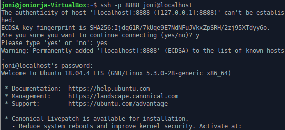 Sain kirjauduttua onnistuneesti sisään, minkä jälkeen kävin muuttamassa porttinumeron tiedostosta /etc/ssh/sshd_config. Asetin porttinumeroksi 8888 (Port 8888) ja tallensin tiedoston. Kirjauduin käyttäen uutta porttinumeroa:
