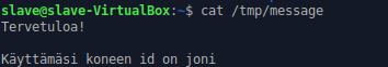 Kyseinen tila luo muotista message -tiedoston orjalle kansioon /tmp/ (tiedostoon tallentuu orjan id). Valitsin kyseisen kansion, koska arvelin sen olevan tarkoitettu väliaikaisille tiedostoille.