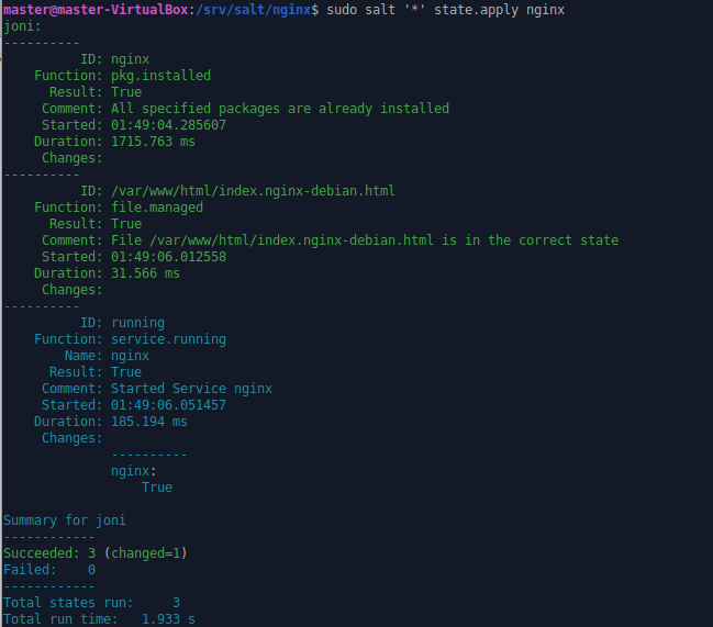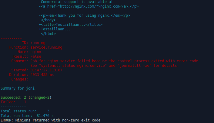 Uudelleen nimesin kopioimani tiedoston testi.html -nimiseksi, minkä jälkeen tein nginx -kansioon init.sls tiedoston seuraavalla sisällöllä: