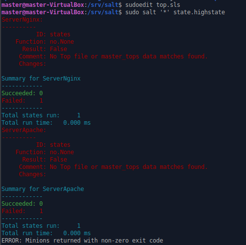 Koitin ajaa koko tekeleen komennolla sudo salt ’*’ state.highstate ja sain virheilmoituksen.