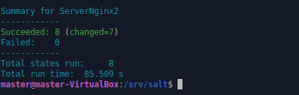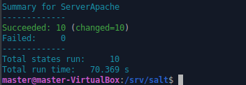 Minulla oli kaikki tilatiedostot omissa kansioissaan, ja top.sls niiden ulkopuolella. En ole varma ymmärsinkö oikein, mutta kopioin kaikkien kolmen käyttämäni tilan .sls -tiedostot samaan paikkaan, jossa top.sls oli(/srv/salt/). Muutin varmuuden vuoksi niiden nimet (init.sls -> editing.sls, apache.sls ja nginx.sls). Ajoin highstate-komennon uudestaan, ja nyt kone jäi raksuttamaan. Reilun minuutin jälkeen tuli ilmoitukset onnistuneista tilojen suorittamisista. Toiselle koneelle ajettiin apache.sls ja editing.sls:stä darktable, ja toiselle nginx.sls ja editing.sls:stä gimp. Tavallisesti servereille tuskin asennettaisiin kuvankäsittelyohjelmia, mutta orjien rajallisesta määrästä johtuen täytyi hiukan oikoa.