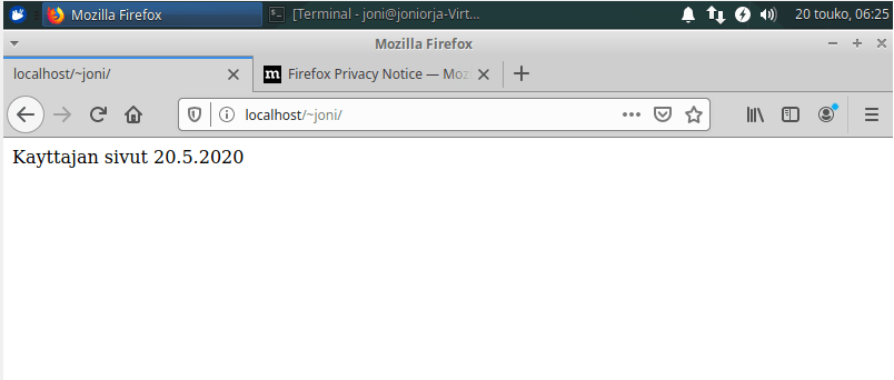 Tila asentaa Apachen, vaihtaa oletussivun, mahdollistaa käyttäjän luoda sivuja, asentaa ssh:n ja ottaa motd:n templatesta. Varmistaa myös, että apache ja ssh ovat käynnissä ja tarkkailee tiettyjä tiedostoja muutosten varalta. Vaihdettavaan oletussivuun kirjoitin ”Tämä on Apance-webbipalvelin”.