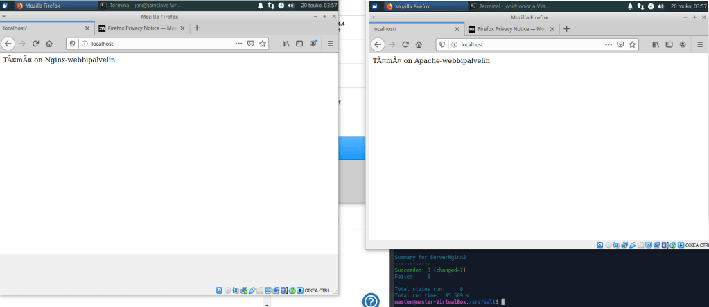 En tiedä yhtään, vastasiko tämä tehtävänantoon. Oli jälleen todella haastavaa miettiä, millaisia ongelmia Saltin avulla voisi ratkoa, kun ei ole vielä päässyt käyttämään Linuxia tuotantoympäristössä ja muutenkin Linuxin opettelu on vasta alussa. Oli kuitenkin mielenkiintoista tehdä tätä tehtävää, ja samalla tuli opittua uutta.