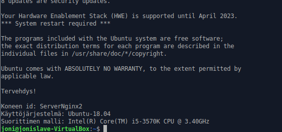 Tila asentaa nginx:n ja openssh:n ja tarkistaa, että ne ovat käynnissä. Nginx:n oletussivu vaihdetaan toiseen (Sisällöksi kirjoitin ”Tämä on nginx-webbipalvelin” ), ssh:n oletusportti vaihdetaan portiksi 8888 ja motd-viesti kerää templaten avulla orjakoneen tietoja näytettäväksi kun ssh:lla kirjaudutaan sisään.